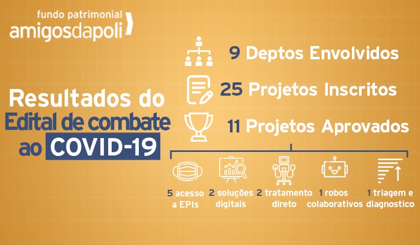 É com muito orgulho que gostaríamos de divulgar os 11 projetos apoiados no nosso Edital de Combate ao COVID-19. Em um processo relâmpago que durou uma semana, conseguimos captar, avaliar e já começar a apoiar diversos projetos da comunidade politécnica que estão contribuindo para o combate ao coronavirus ou ajudando a melhorar a qualidade de vida durante a pandemia. Fique por dentro deles: